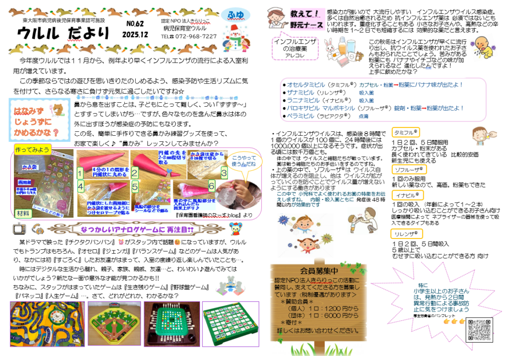 ウルルだより冬号 2025.12.18ウルルだより Tweet Share +1 Hatena Pocket RSS feedly Pin it 今回のナース情報は、『インフルエンザの治療薬について』です。この時期ならではの内容なので、ぜひ参考にしてくださいね☃ ウルルは12月29日(月)~1月2日(金)が冬季休業のため休室となり、新年は1月5日(月)から開室します。 Tweet Share +1 Hatena Pocket RSS feedly Pin it 投稿者: kirakiraing ウルルだより コメント: 0 【2025年12月】予定表 【2026年1月】予定表 コメント ( 0 ) トラックバック ( 0 ) この記事へのコメントはありません。 この記事へのトラックバックはありません。 トラックバック URL 返信をキャンセルする。 Warning: Undefined variable $user_ID in /home/xs809642/kirarikko-kids.com/public_html/wp-content/themes/vogue_tcd051/comments.php on line 98 名前 ( 必須 ) E-MAIL ( 必須 ) ※ 公開されません URL 関連記事一覧 ウルルだより ウルルだより 🍁ウルルだより秋号をお届けします... うるるだより夏号をお届けします♪ ウルルだより春号 ⛄ウルルだより冬号❄...