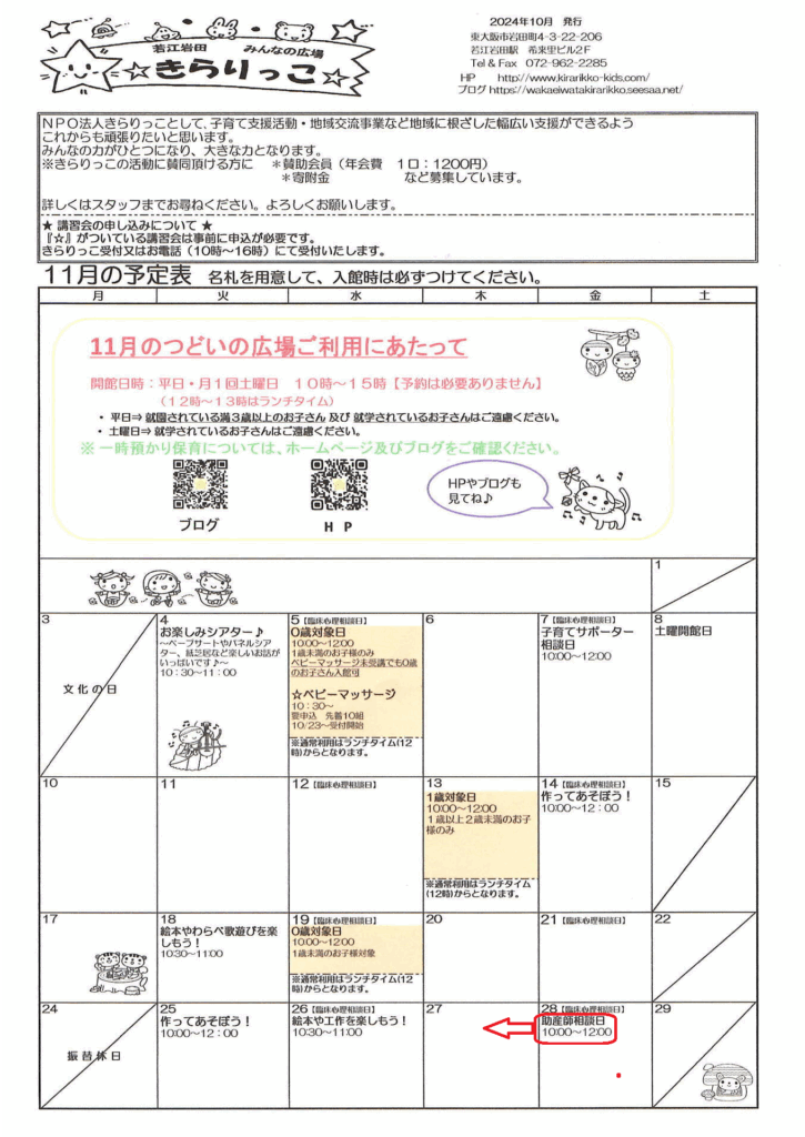 ⇒27日(木)助産師相談日10:00~12:00に変更になりました